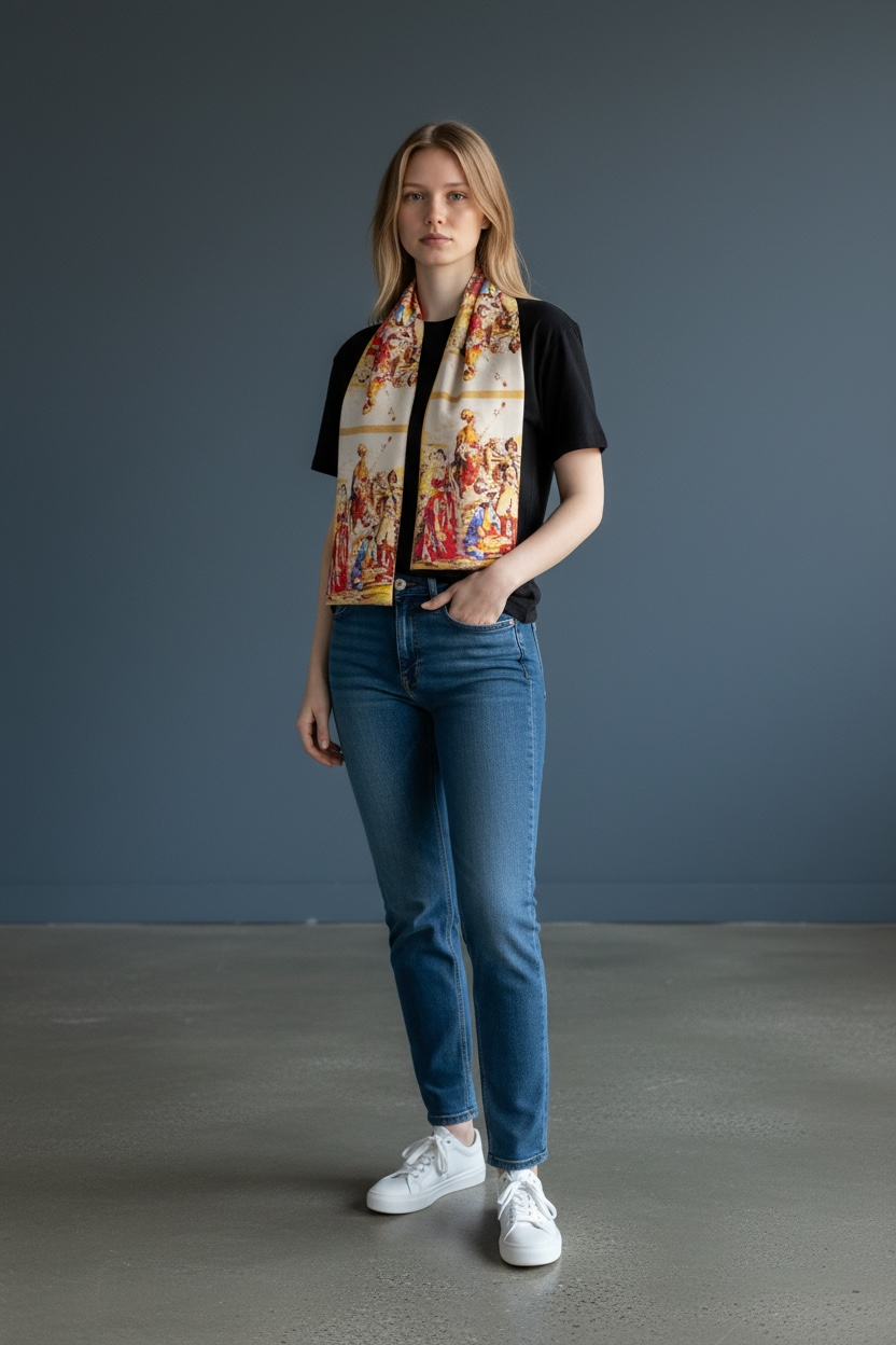 Silk scarf printed with original painting of Anet Abnous titled " Armenian women with odor men" is a digital print of mixed media impressionist painting of Armenian woman with traditional Taraz and Men from different neighboring region of Armenia admiring her beauty.Scarf has colorful patterns of warm reds, oranges and beige with blue boarder with machine hemming.