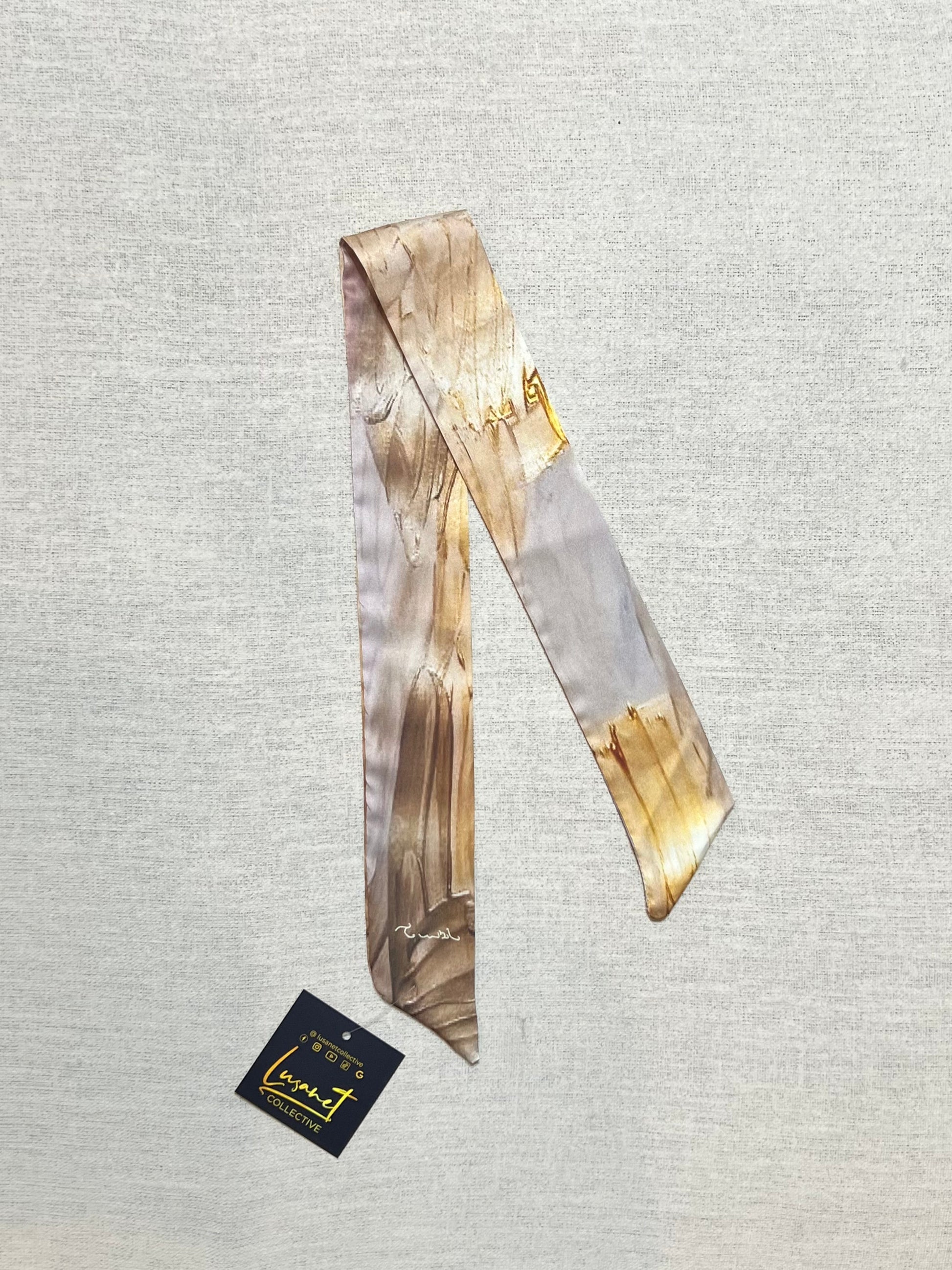 The Crimson Tide Twilly by Charles Scarves, handmade in Armenia, blends waves of deep red with cool blue and neutral grey tones for a striking, modern design. Its abstract brushstrokes capture movement and contrast, turning this slim scarf into a ribbon of wearable art. Versatile and chic, you can style it around your neck, tie it in your hair, wrap it on your wrist, or adorn your handbag. Bold yet elegant, this twilly adds personality and artistry to any look.