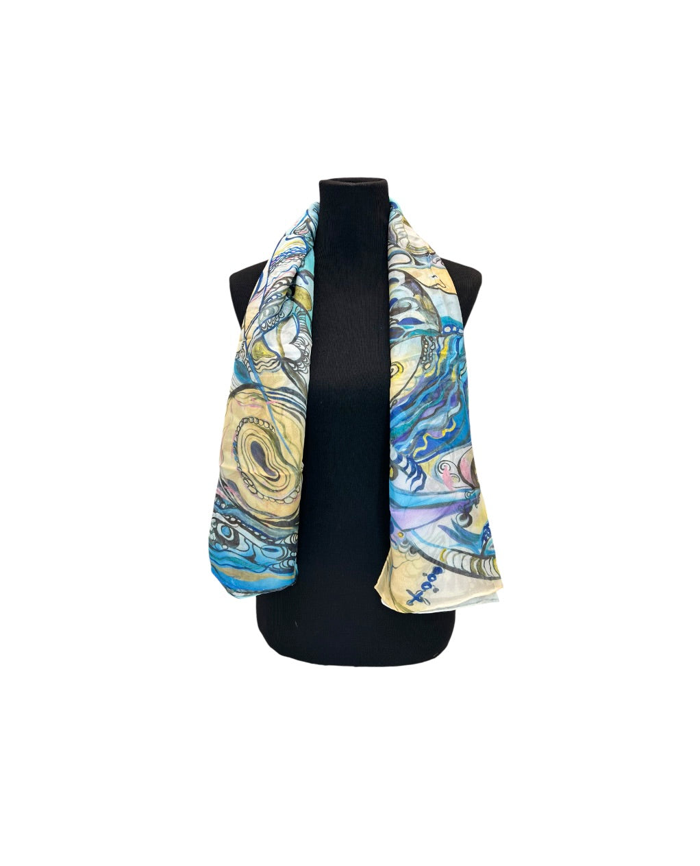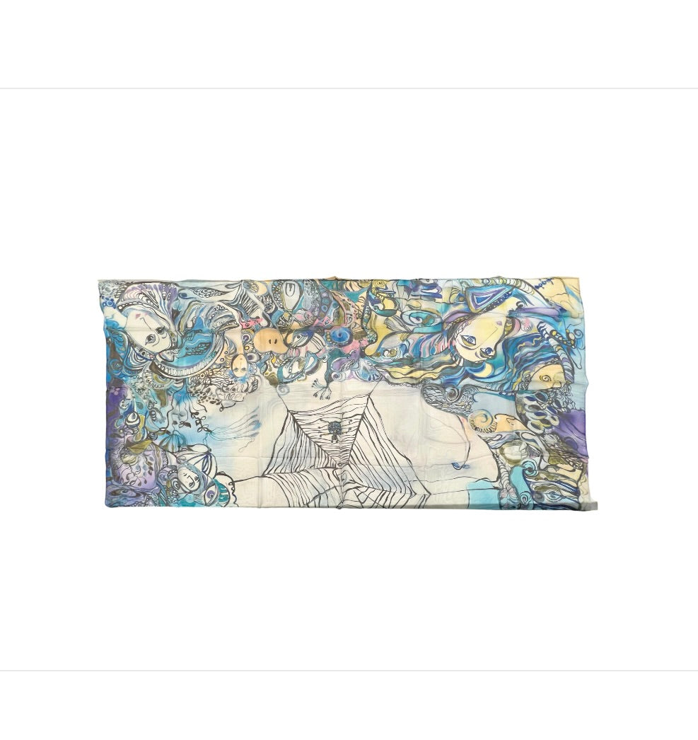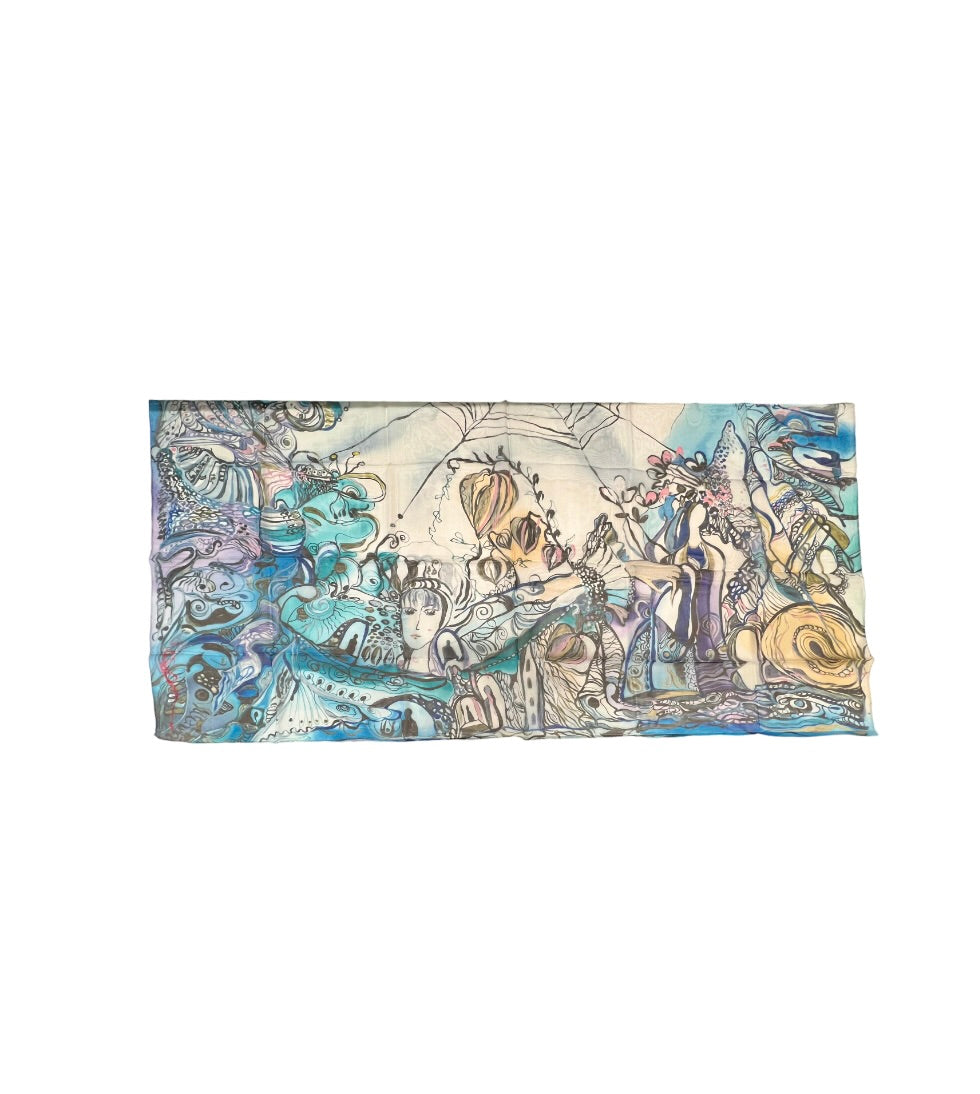 This digital-printed silk scarf features original art with a serene design in calm colors. It elegantly depicts women’s faces and figures intertwined with a delicate spider and its web. The scarf is thoughtfully packaged in a beautiful gift-wrapping envelope, making it a perfect present for those who appreciate unique artistry and style.