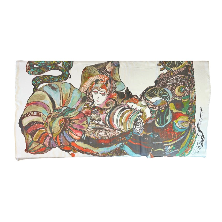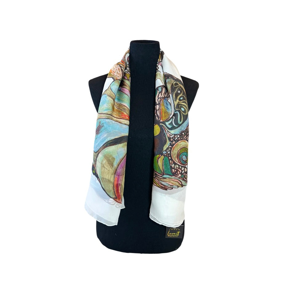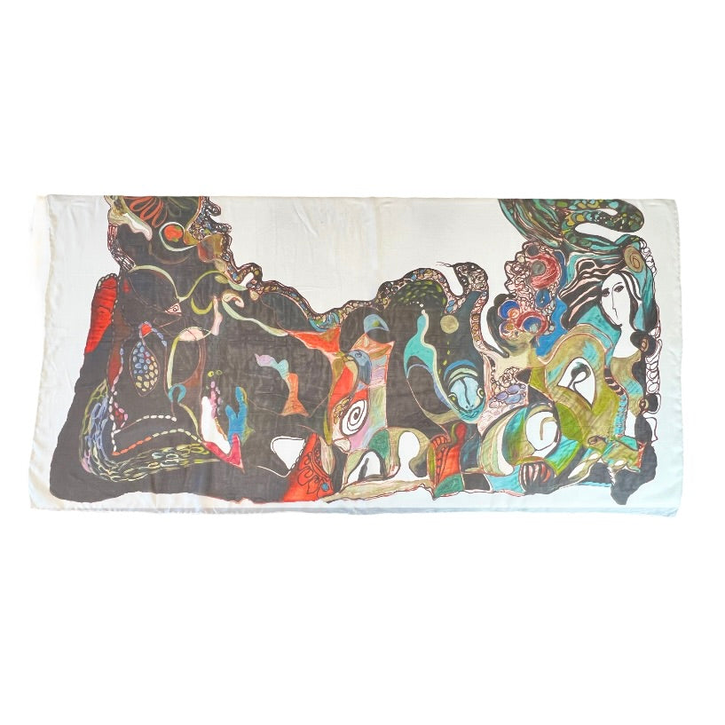 Embrace the allure of art with this stunning silk scarf, digitally printed with original artwork that captures the essence of abstract elegance. Featuring an array of harmonious colors and intricate patterns, this scarf is a statement piece that elevates any look. Crafted from high-quality silk, it offers a smooth, luxurious feel and drapes beautifully. Arrives in a beautifully designed gift envelope, making it a thoughtful and stylish gift.