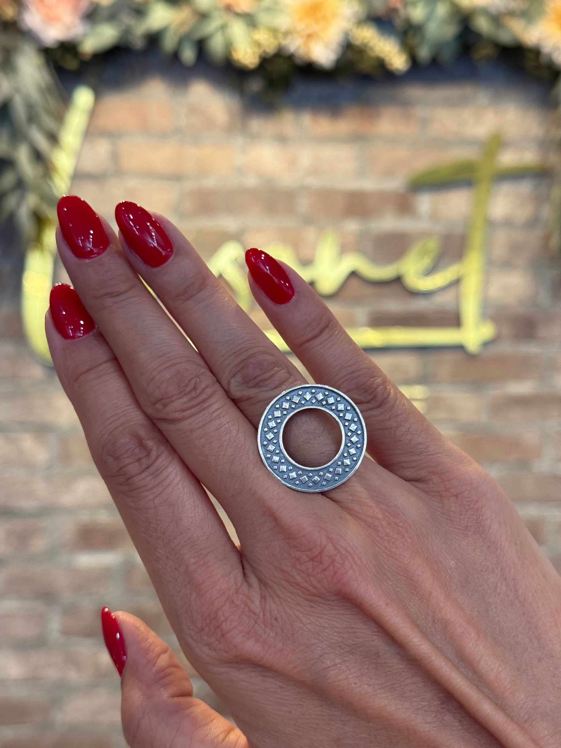 The Geometric Circle Silver Ring by Vardan Artemyan is a statement piece that merges modern design with timeless Armenian artistry. Handcrafted in sterling silver, the ring features an open circular center framed with intricate geometric patterns, symbolizing wholeness and strength. Its bold silhouette makes it ideal for those who love jewelry with meaning and edge.
