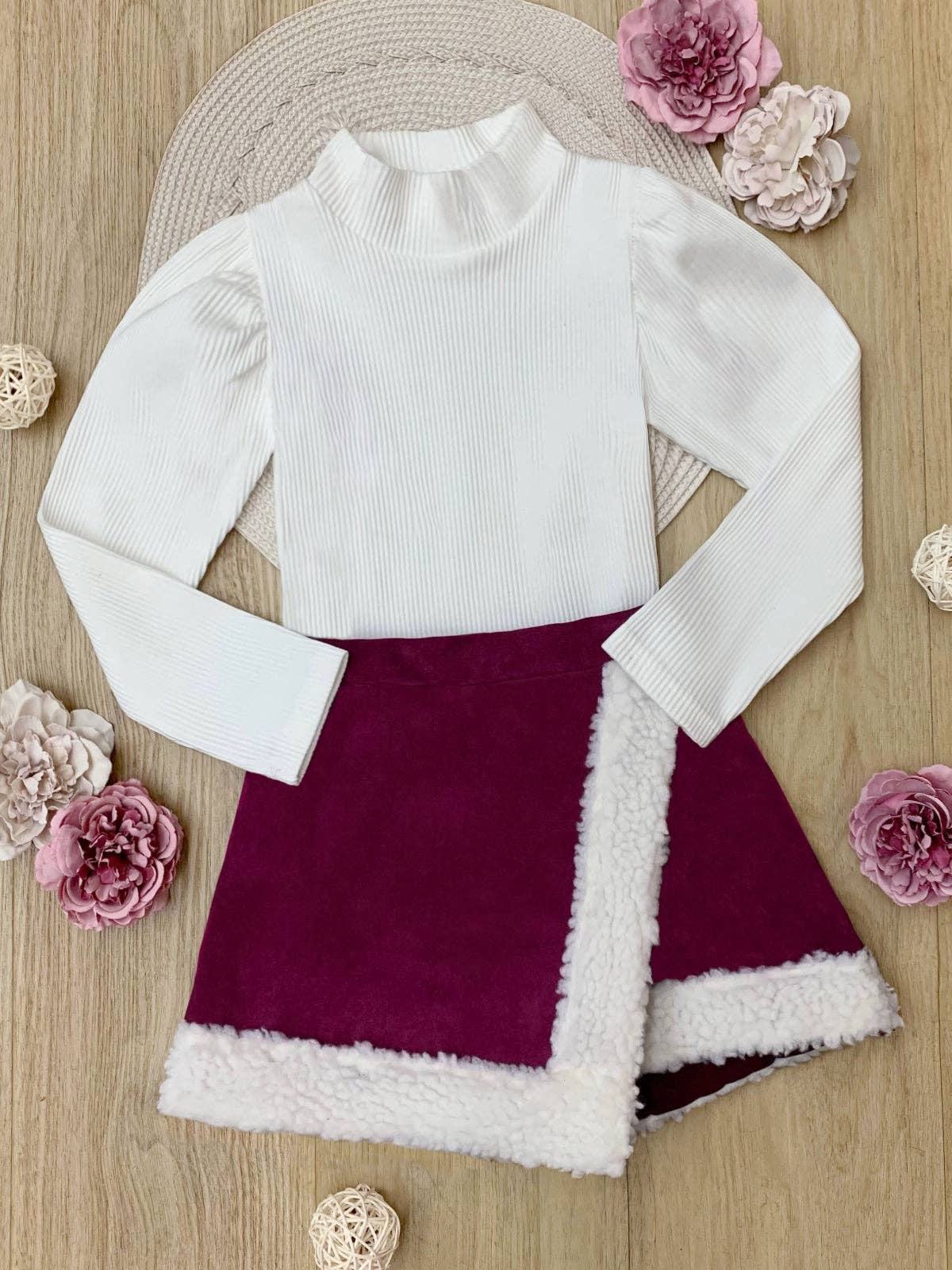 Ivory Ribbed Turtleneck Top and Berry Faux Suede Fur-Trimmed Skort Set