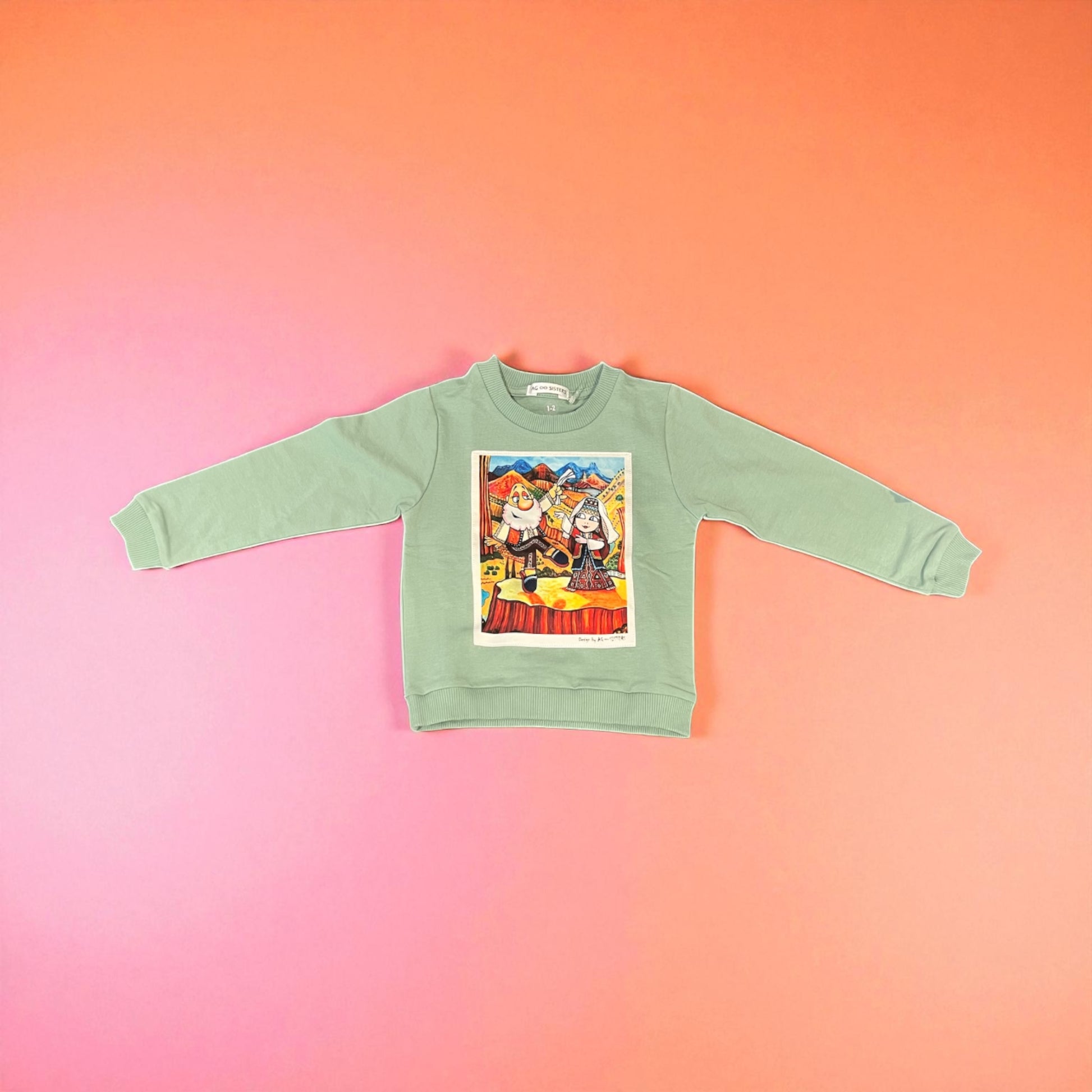 Soft, stylish, and full of charm—this AG Sisters Sage Green Kids Sweatshirt brings a fresh, earthy tone to your child’s wardrobe. Made from a cozy cotton blend, the calming sage green color beautifully highlights the vibrant Armenian folk-art illustration on the front, featuring two playful characters in a colorful village and mountain scene.