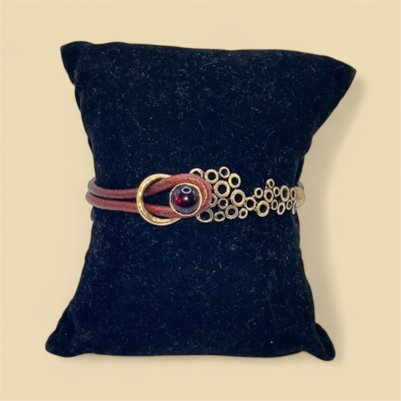 Add a touch of artistic flair with this handmade leather bracelet featuring a unique brass bubble design accented by a smooth stone centerpiece.