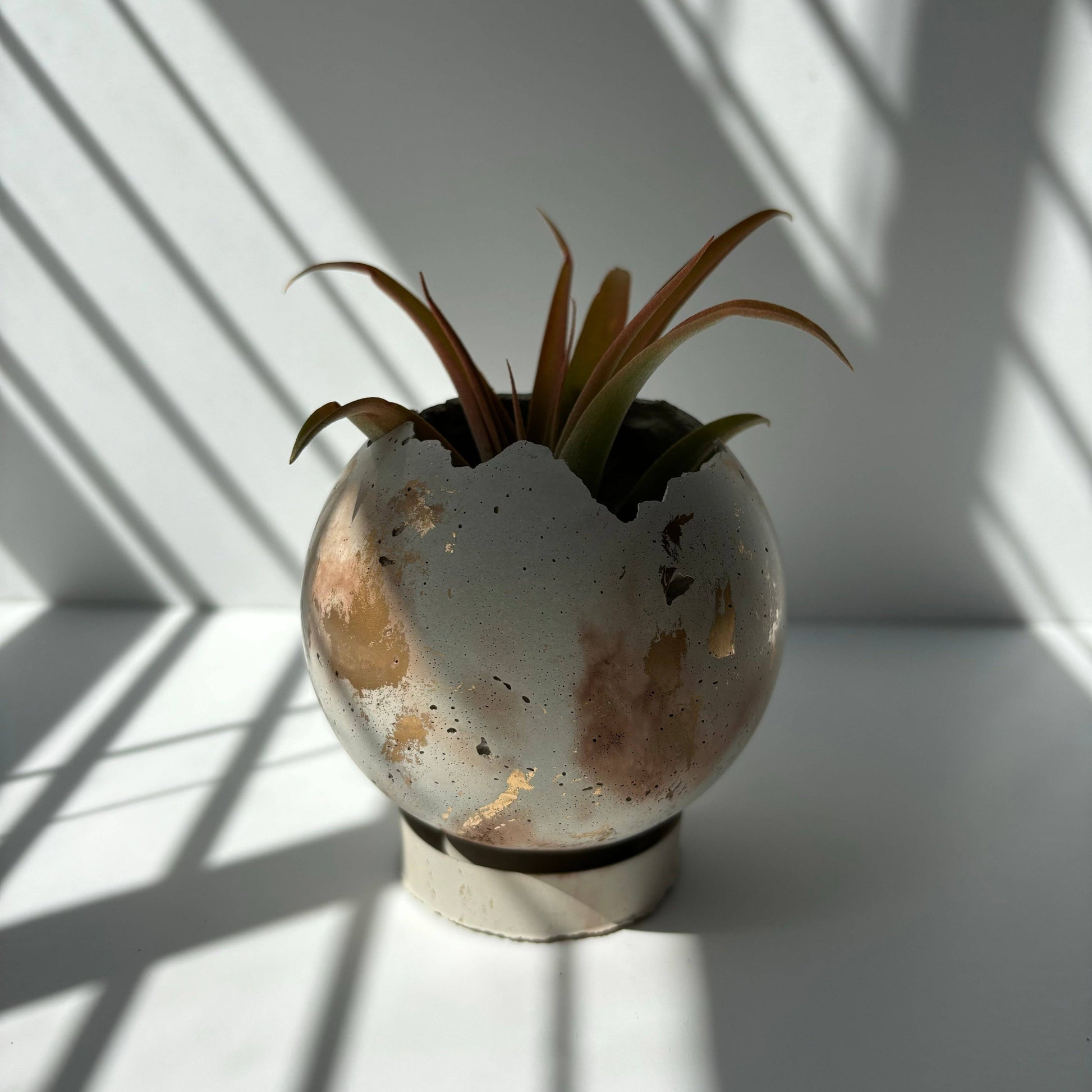 Mini-Moon 3” Pot | Sphere Planter | Ball Concrete Planter: Light Gray & Gold / Hole