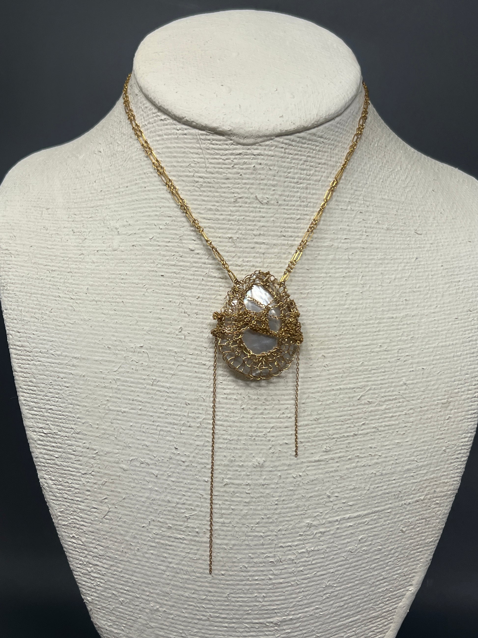 This beautiful necklace features a luminous mother of pearl teardrop pendant delicately wrapped in 18K gold-filled wire. Its graceful design and natural iridescence make it a timeless and versatile statement piece, perfect for both everyday wear and special occasions.
