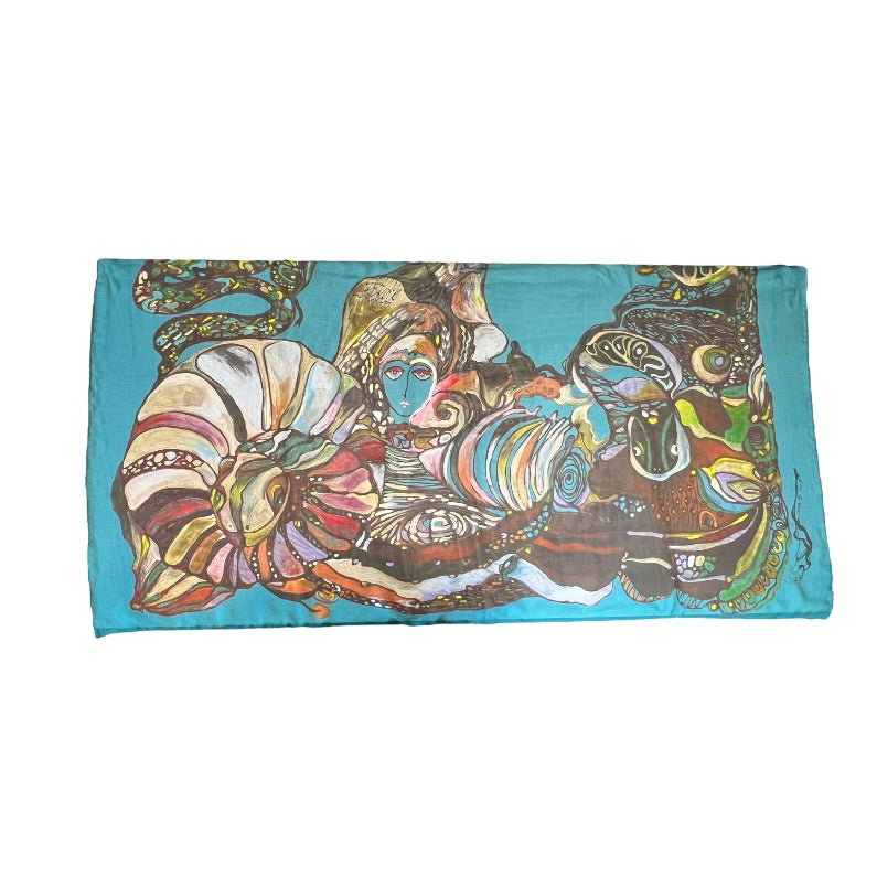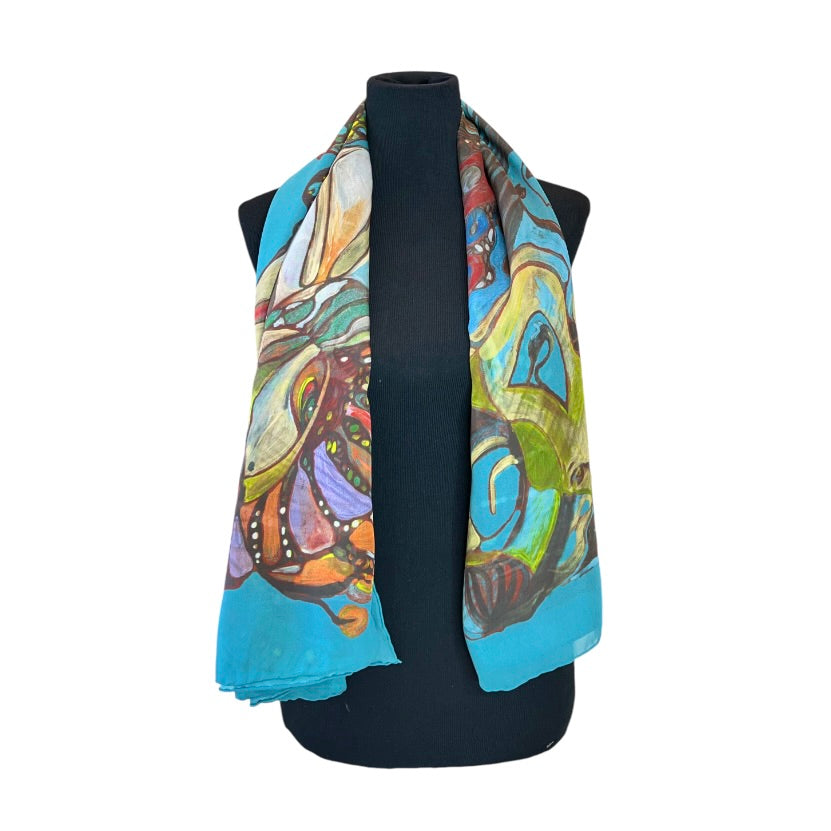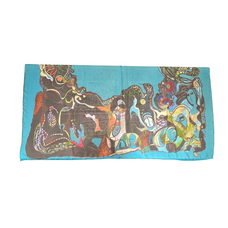 Make a bold style statement with this silk scarf, digitally printed with original art that celebrates vibrant colors and intricate shapes. The unique design brings energy and sophistication to any outfit, while the high-quality silk provides a soft, luxurious feel. Presented in an elegant gift envelope, this scarf makes a memorable gift for any art or fashion lover.