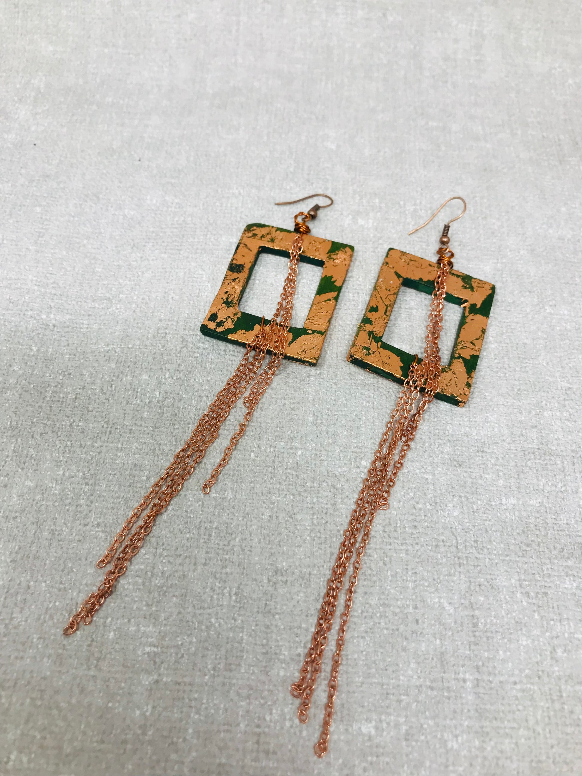 Introducing Yevart's "Emerald Whispers" earrings—a sublime fusion of Armenian heritage and contemporary chic. Green wood intricately adorned with copper leaf motifs gracefully suspends from copper chains, creating an enchanting interplay of textures. These earrings embody Yevart's commitment to unique design and refined elegance. Elevate your style with this captivating accessory, seamlessly blending tradition with modern sophistication for a distinctive look.