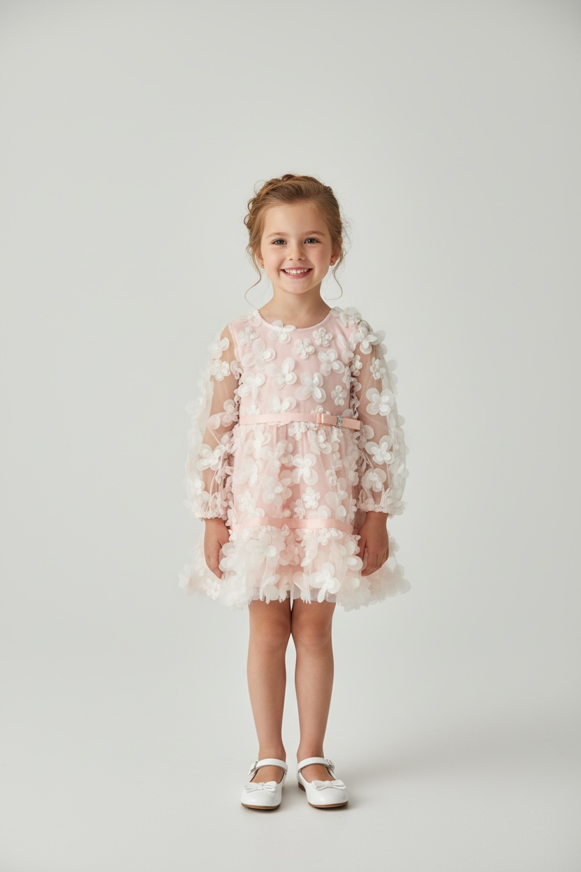 This charming dress features a classic design in an elegant pink color. Delicate pink butterflies, embroidered on the dress, add a touch of sweetness without overwhelming the simple elegance.