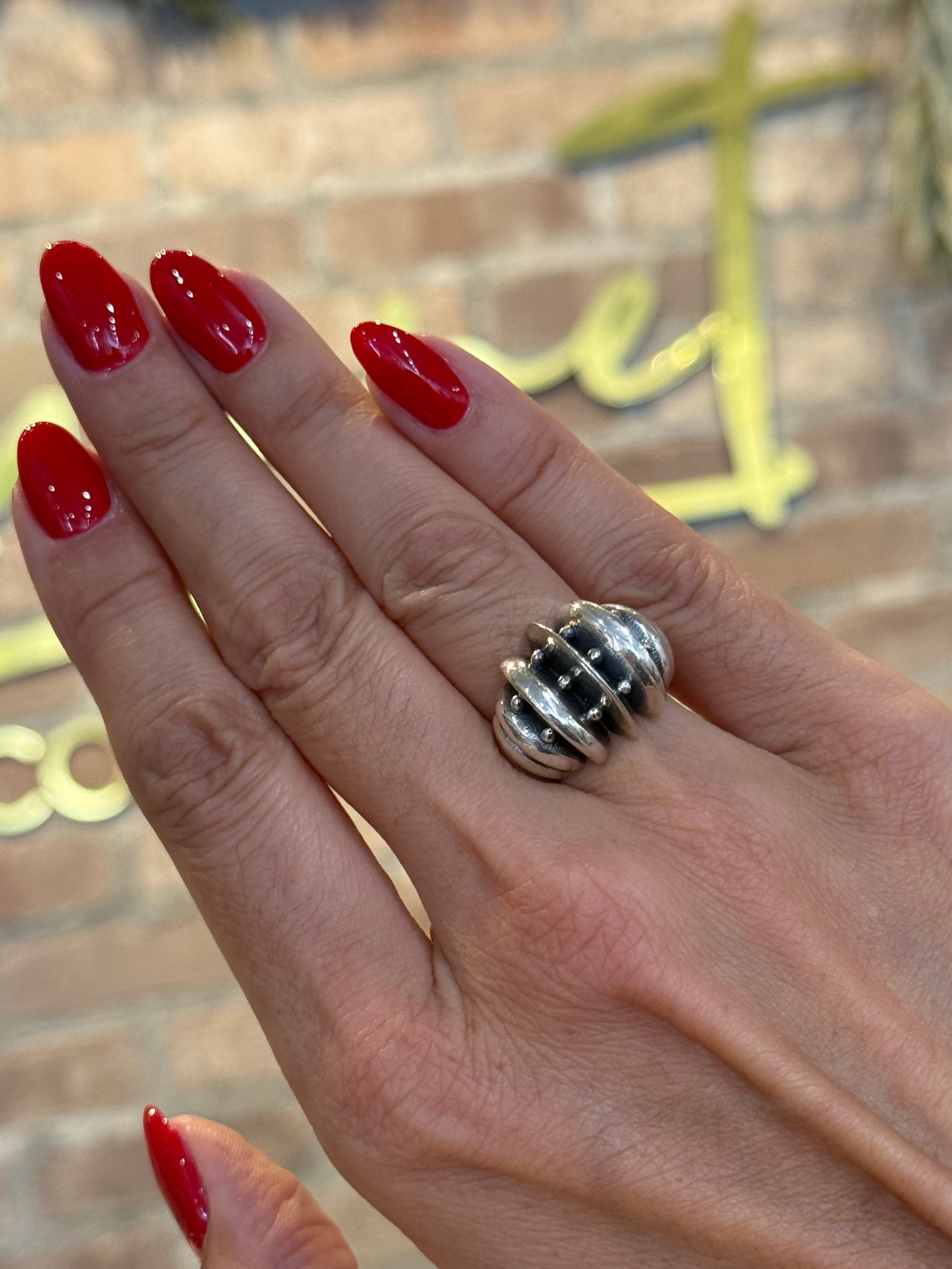 The Sculpted Coil Silver Ring by Vardan Artemyan is a striking example of wearable art. Handcrafted in Armenia, this sterling silver ring features layered, rounded coils stacked together to create depth, texture, and a bold sculptural effect. Its adjustable design ensures comfort, while the unique form makes it a powerful statement piece for any collection.