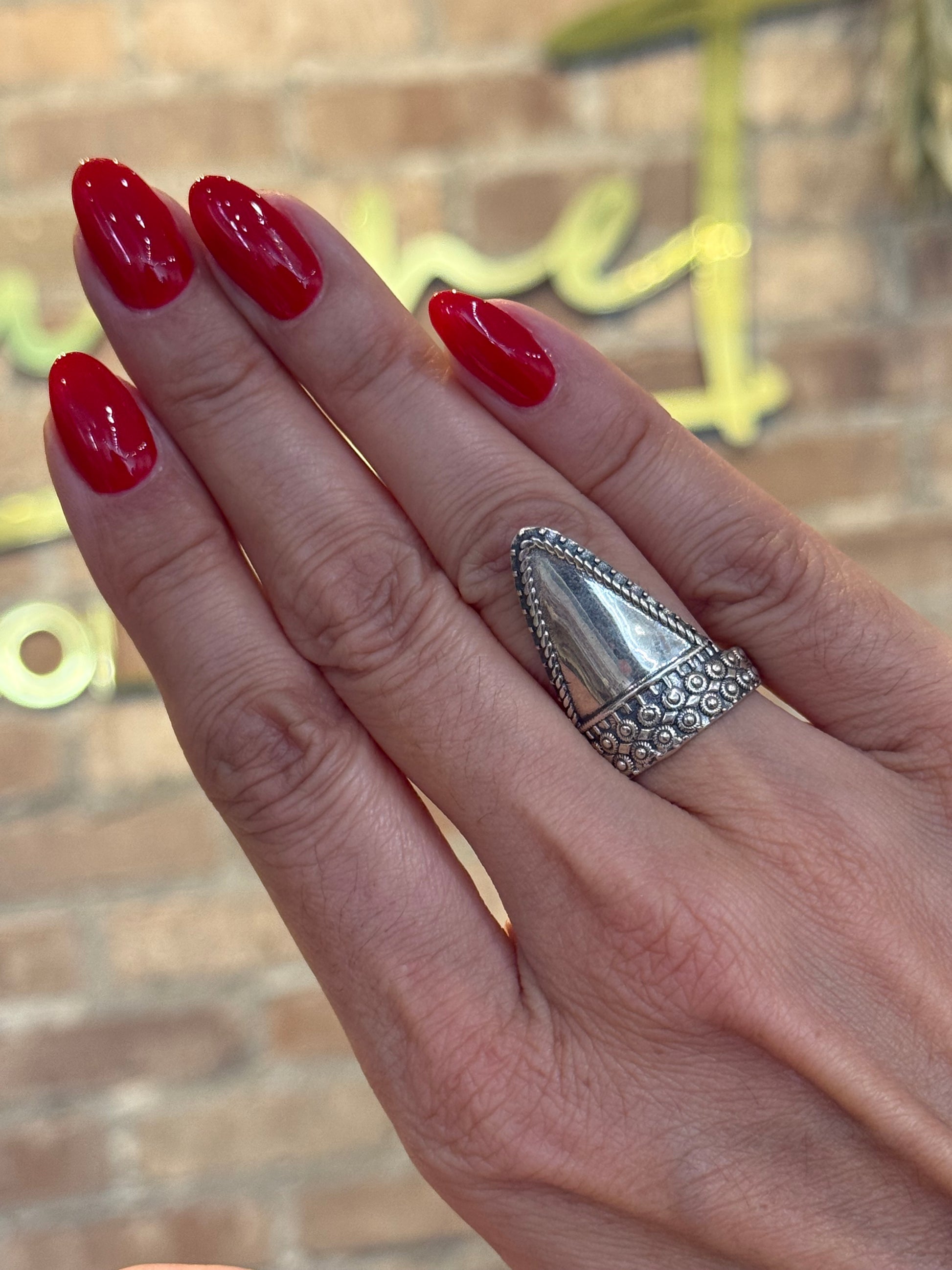 Make a statement with the Silver Shield Ring by Vardan Artemyan, a striking design inspired by strength and heritage. Handcrafted in Armenia, this sterling silver ring features an elongated shield silhouette adorned with ornate detailing and braided edging. The bold design adds an element of power while maintaining refined artisan beauty. A perfect ring for those who appreciate jewelry that embodies resilience and tradition.