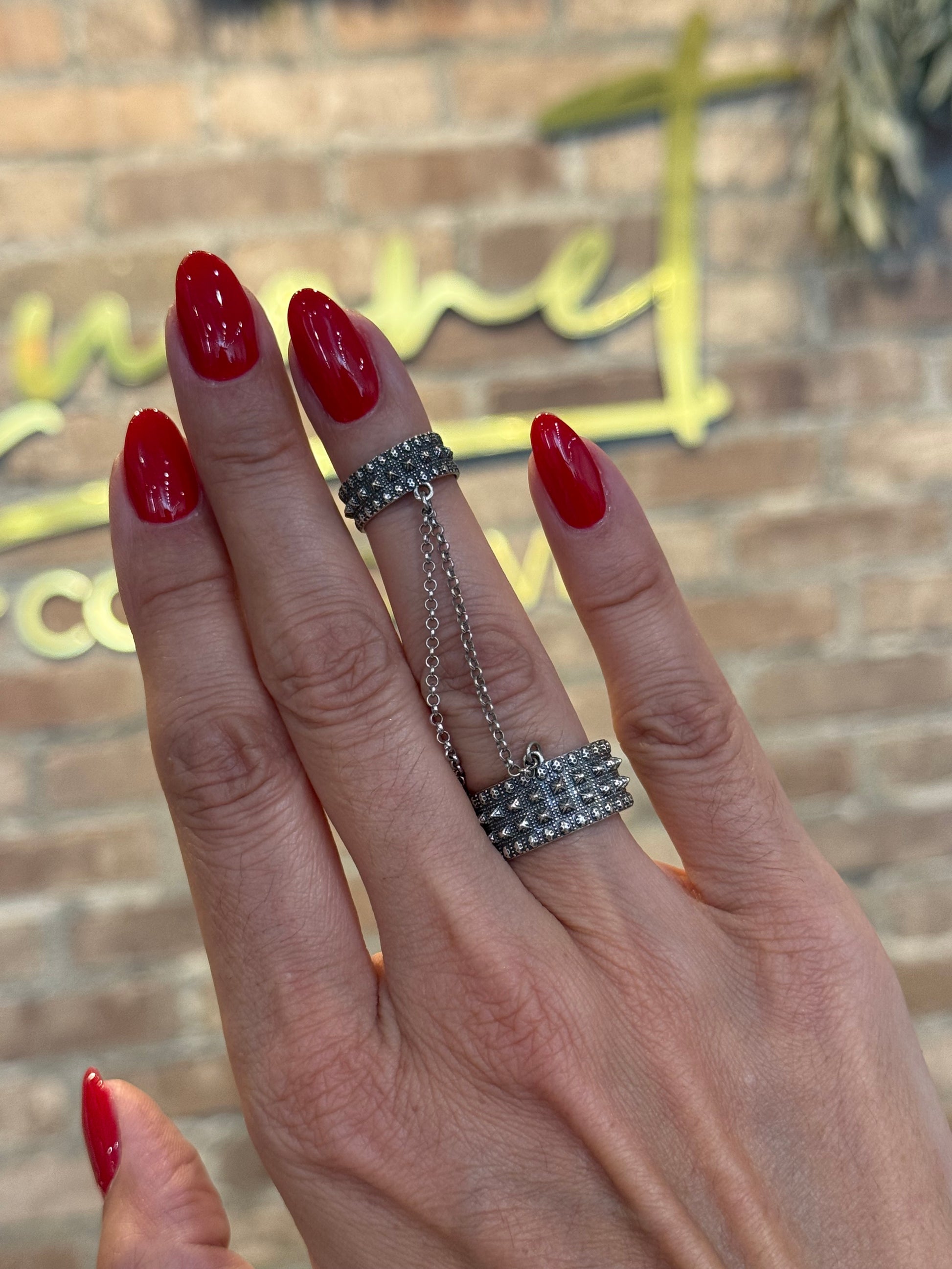 The Silver Warrior Chain Ring by Vardan Artemyan combines strength and artistry in a daring design. Featuring two textured sterling silver bands connected by delicate chains, this piece evokes armor-inspired elegance. The bold studded detailing adds edge, while the dual-band connection symbolizes unity and resilience. A true statement ring, it’s perfect for those who want to showcase individuality with a touch of heritage craftsmanship.