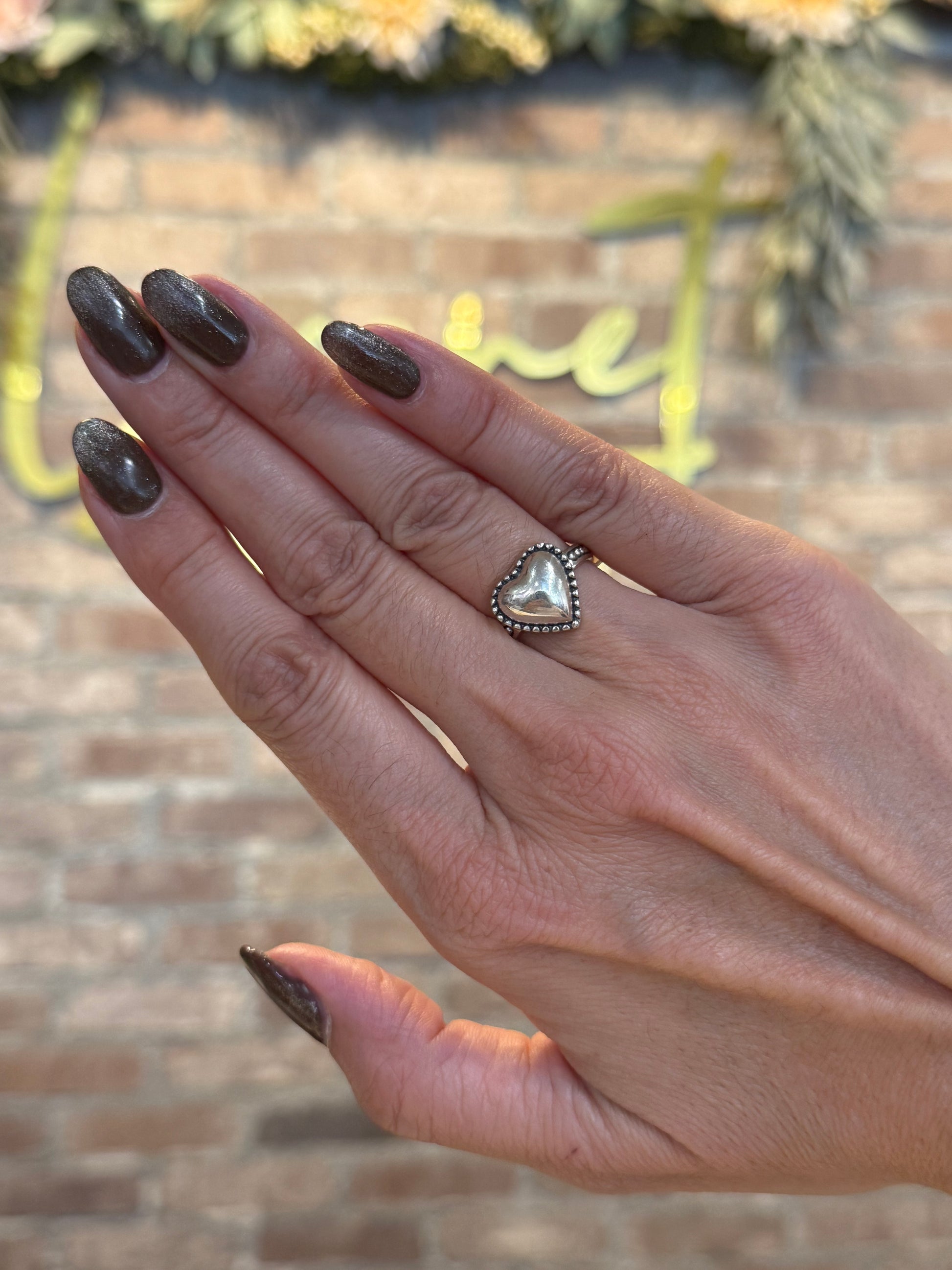 Celebrate love and craftsmanship with this small Silver Beaded Heart Ring by Vardan Artemyan. Handcrafted in Armenia, this adjustable sterling silver ring features a softly domed heart framed with delicate beaded detailing. The open band ensures a comfortable fit, making it versatile for everyday wear or as a thoughtful gift. A timeless piece that beautifully blends romance with Armenian artisan heritage.