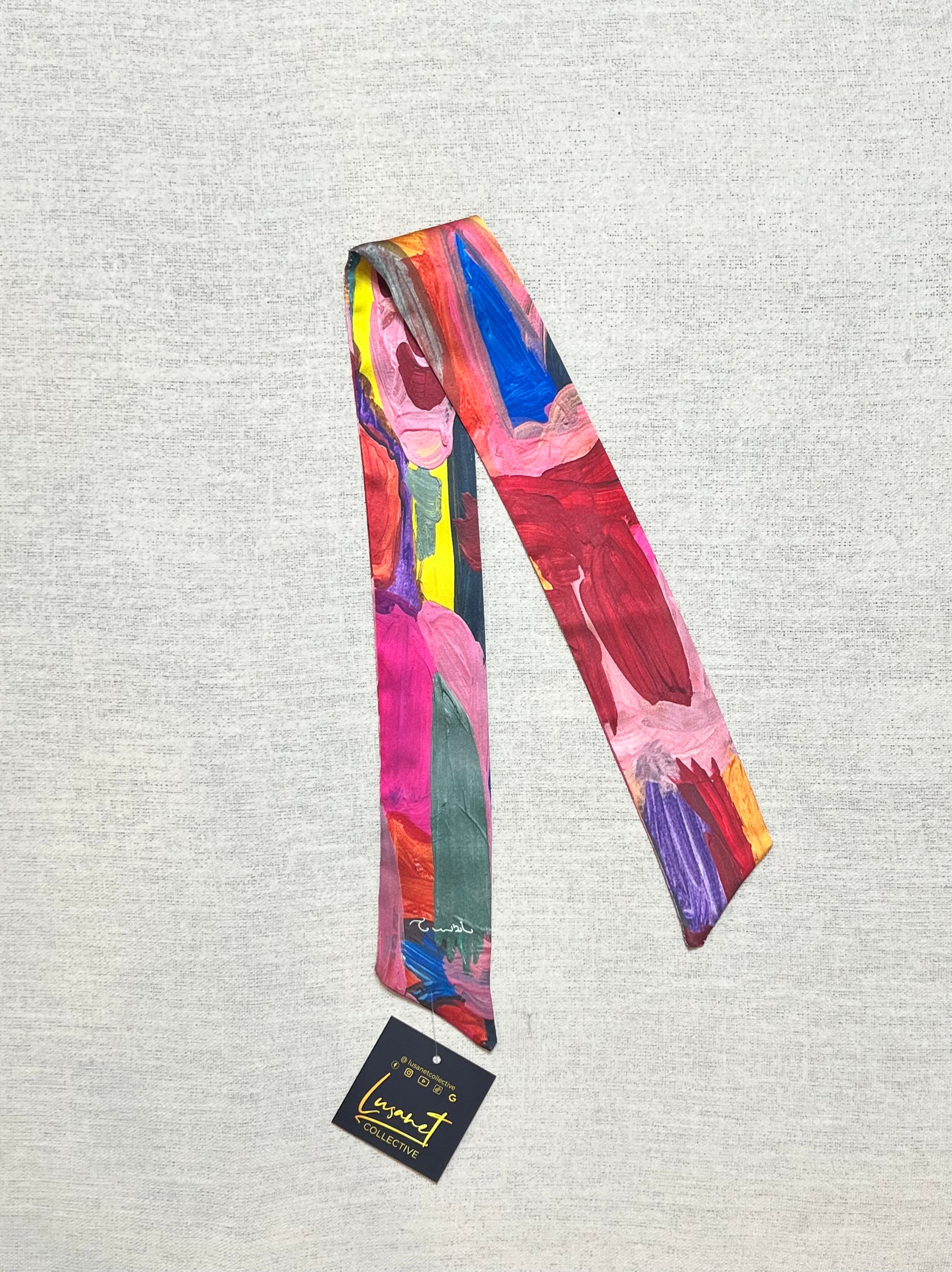 The Sunrise Bloom Twilly by Charles Scarves, handmade in Armenia, radiates joy with a playful mix of pink, blue, orange, and yellow tones. Its abstract design feels like the first light of morning, full of warmth and movement. This slim scarf is endlessly versatile — style it as a chic neck tie, colorful hair ribbon, bracelet-like wrist wrap, or as a bright accent on your favorite handbag. A lively ribbon of wearable art, it brings Charles’ creativity and color into your everyday style.