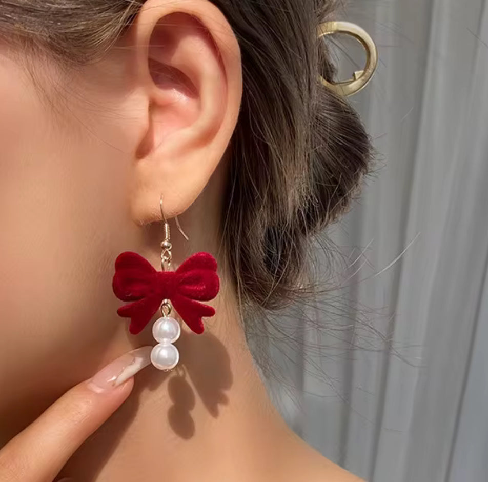 Elevate your style with this luxurious velvet bow earring set, designed for those who adore elegance with a girly twist. Each earring features a soft, plush velvet bow that exudes sophistication, beautifully complemented by a double pearl drop design for a bold finish. The perfect blend of charm and opulence, these earrings are ideal for special occasions, romantic evenings, or adding a touch of femininity to your everyday look.