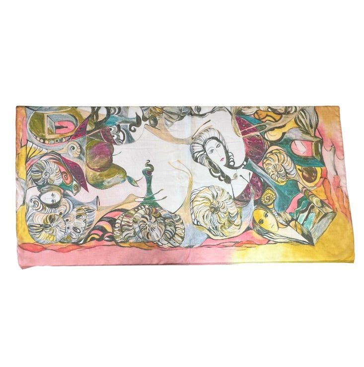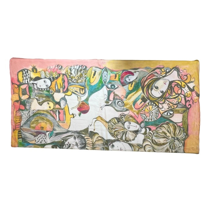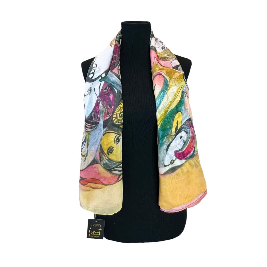 Elevate your style with this exquisite silk scarf, digitally printed with captivating original artwork featuring beautiful women faces. The vibrant colors and intricate details make it a wearable masterpiece, adding sophistication to any outfit. Made from high-quality silk, it feels luxurious on the skin and drapes beautifully.