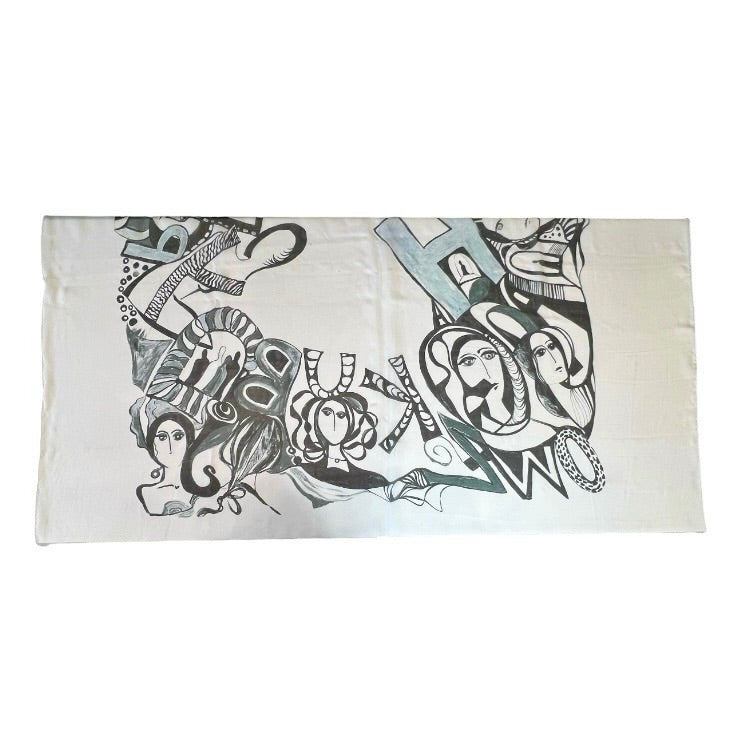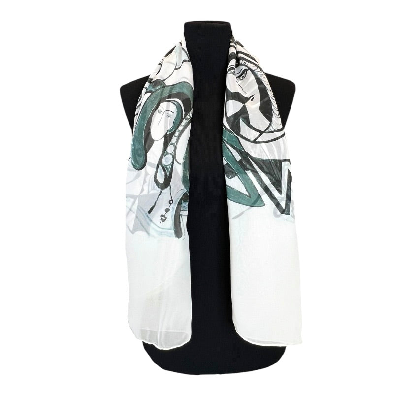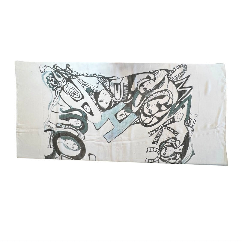 Add a touch of whimsy to your wardrobe with this white artistic silk scarf, featuring a blend of abstract women faces and fluid lines. Digitally printed with stunning original artwork, it captures a sense of movement and creativity. Crafted from premium silk, this scarf is a luxurious accessory for any occasion. Arrives in an exquisite gift envelope, ready to surprise and delight.