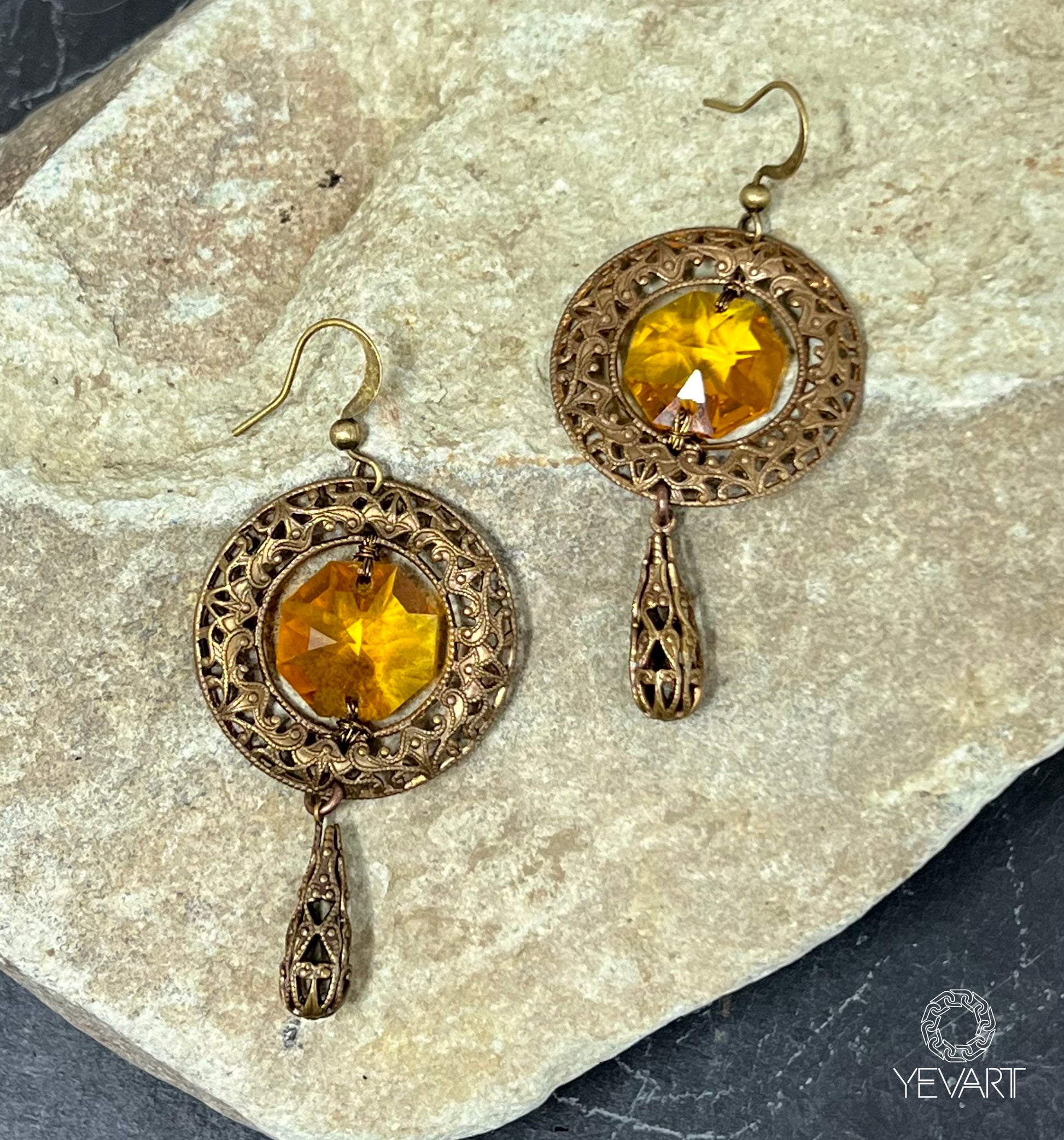 Introducing Yevart's "Sunset Filigree" earrings—a radiant fusion of Armenian craftsmanship and contemporary allure. Intricate bronze filigree elements gracefully embrace vibrant orange Swarovski crystals, creating a captivating play of light. These earrings are a testament to Yevart's commitment to unique design and refined elegance. Elevate your style with this exquisite accessory that seamlessly marries tradition and modern sophistication.